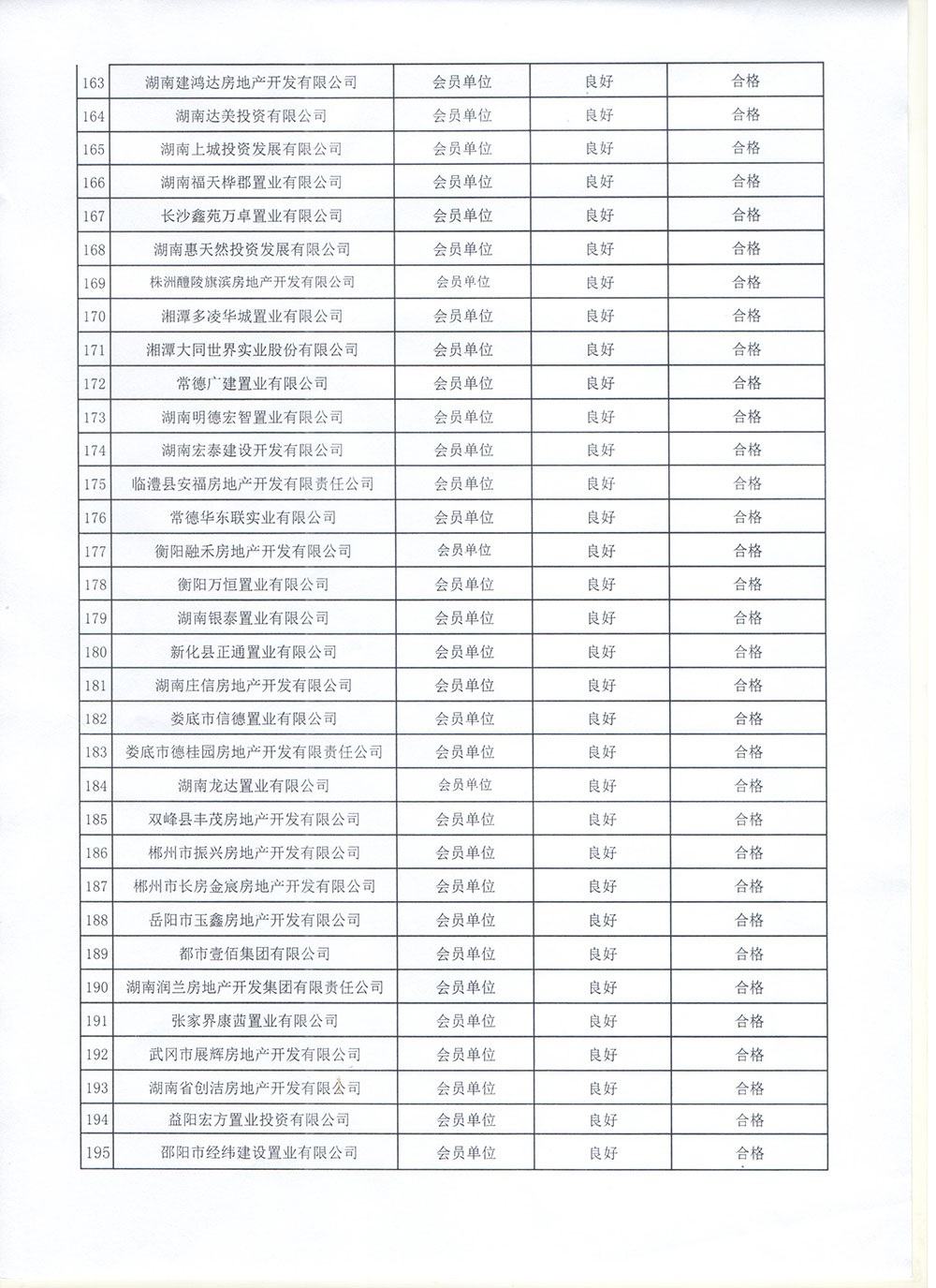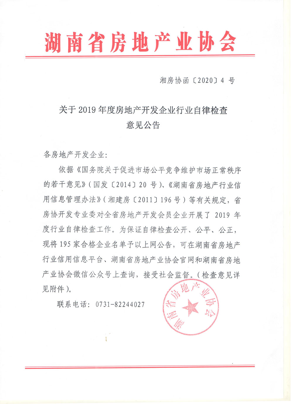 依據(jù)《國務(wù)院關(guān)于促進(jìn)市場公平競爭維護(hù)市場正常秩序的若干意見》(國發(fā)〔2014〕20號)、《湖南省房地產(chǎn)行業(yè)信用信息管理辦法》(湘建房〔2011〕196號)等有關(guān)規(guī)定,省房協(xié)開發(fā)委對全省房地產(chǎn)開發(fā)會員企業(yè)開展了2019年度行業(yè)自律檢查工作。為保證自律檢查公開、公平、公正,現(xiàn)將195家合格企業(yè)名單予以上網(wǎng)公吿,可在湖南省房地產(chǎn)行業(yè)信用信息平臺、湖南省房地產(chǎn)業(yè)協(xié)會官網(wǎng)和湖南省房地產(chǎn)業(yè)協(xié)會微信公眾號上查詢,接受社會監(jiān)督。(檢查意見詳見附件)。