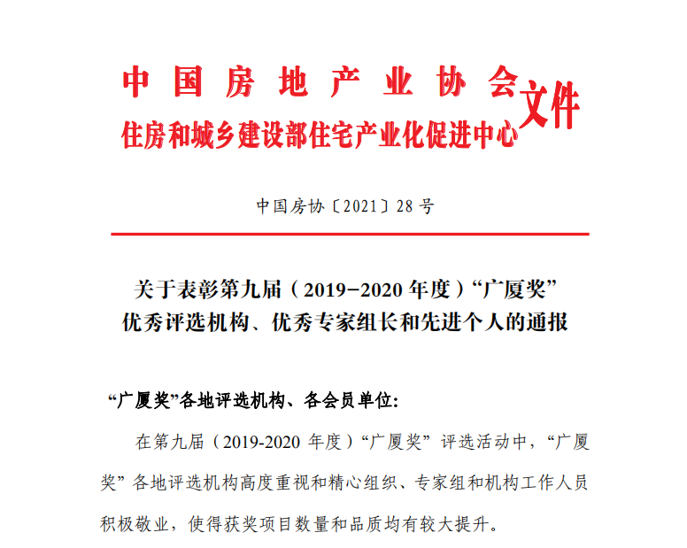 2021年3月16日,中國房地產(chǎn)業(yè)協(xié)會、住房和城鄉(xiāng)建設(shè)部住宅產(chǎn)業(yè)化促進(jìn)中心發(fā)布了《關(guān)于表彰第九屆(2019-2020年度)“廣廈獎”優(yōu)秀評選機(jī)構(gòu)、優(yōu)秀專家組長和先進(jìn)個人的通報》。