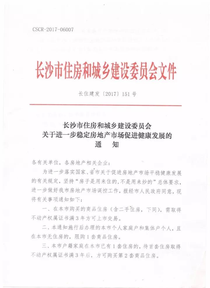為進(jìn)一步落實(shí)國家、省市關(guān)于促進(jìn)房地產(chǎn)市場平穩(wěn)健康發(fā)展的有關(guān)規(guī)定,做好長沙房地產(chǎn)市場調(diào)控工作,經(jīng)市政府同意,市住建委在原有調(diào)控政策基礎(chǔ)上,再次“加碼”,出臺(tái)該通知。通知全面強(qiáng)化了住宅的“居住屬性”,堅(jiān)決抑制其“投資屬性”,規(guī)定“在本市購買的商品住房(含二手住房),需取得不動(dòng)產(chǎn)權(quán)屬證書滿3年方可上市交易”。