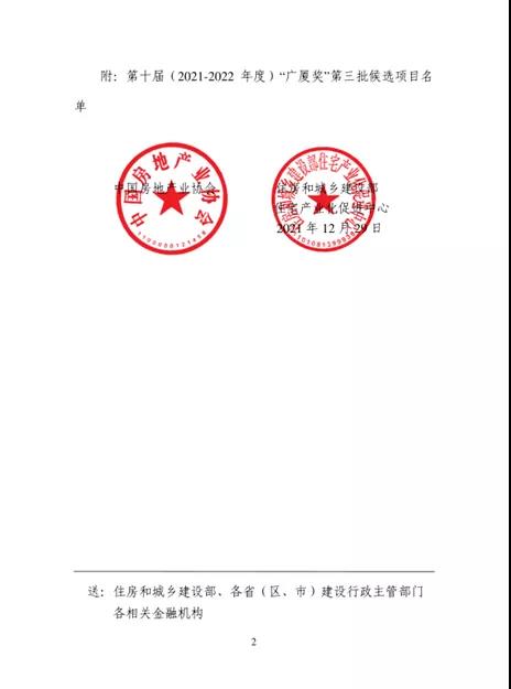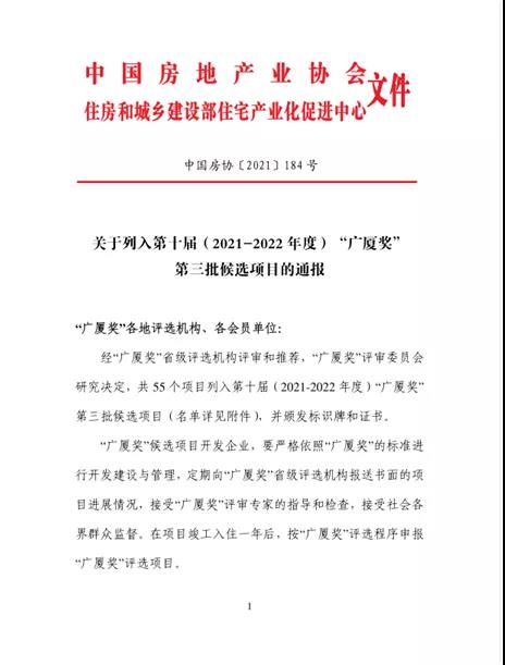 12月29日,由中國房地產業協會、住房和城鄉建設部住宅產業化促進中心共同組織的第十屆(2021-2022年度)“廣廈獎”第三批候選項目名單重磅出爐!經湖南省房地產業協會推薦的長沙市“中建?鈺和城”、懷化市“凱邦?云谷天境”“濱江美墅一期”“佳惠?懷熙府”四個項目榮獲殊榮!