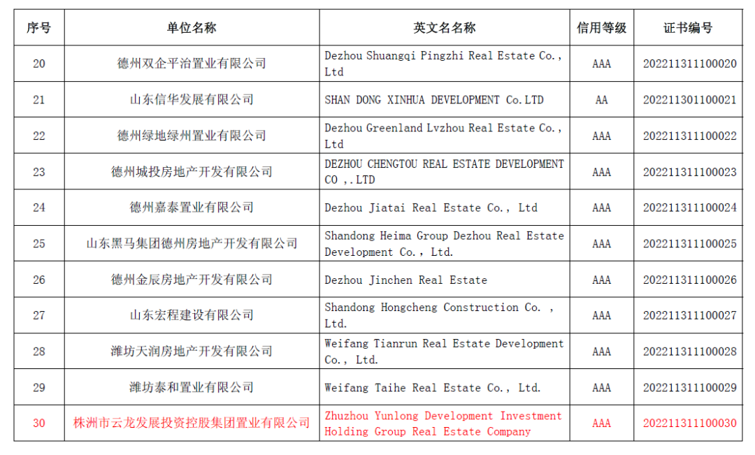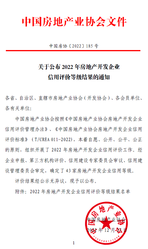 近日,中國房地產業協會公布2022年房地產開發企業信用等級結果。2022年全國房地產開發企業獲得信用等級共有43家。在湖南省房地產業協會的組織和推薦下,株洲市云龍發展投資控股集團置業有限公司獲得信用評價AAA等級。