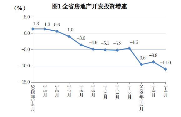 1-4月,全省商品房施工面積30021.40萬平方米,同比下降12.9%,其中住宅施工面積22840.87萬平方米,下降11.1%。房屋新開工面積1305.39萬平方米,下降14.0%,其中住宅新開工面積1028.40萬平方米,下降14.4%。房屋竣工面積1117.85萬平方米,增長4.2%,其中住宅竣工面積861.84萬平方米,增長4.8%。