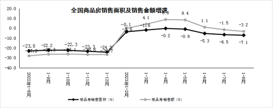 1—8月,商品房銷售面積73949萬平方米,同比下降7.1%,其中住宅銷售面積下降5.5%。商品房銷售額78158億元,下降3.2%,其中住宅銷售額下降1.5%。