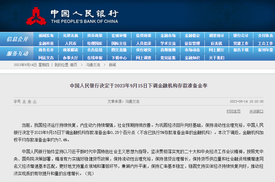 據中國人民銀行官網最新消息,當前,我國經濟運行持續恢復,內生動力持續增強,社會預期持續改善。為鞏固經濟回升向好基礎,保持流動性合理充裕,中國人民銀行決定于2023年9月15日下調金融機構存款準備金率0.25個百分點(不含已執行5%存款準備金率的金融機構)。本次下調后,金融機構加權平均存款準備金率約為7.4%。