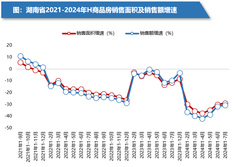 截止2024年7月,湖南省統計局數據顯示,全省商品房銷售面積2428.66萬方,同比下降28.8%,商品房銷售金額1540.32億元,同比下降30.5%。市場整體信心不足,部分城市出現房價下跌。