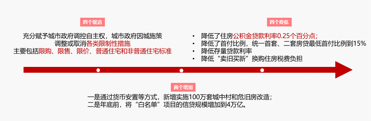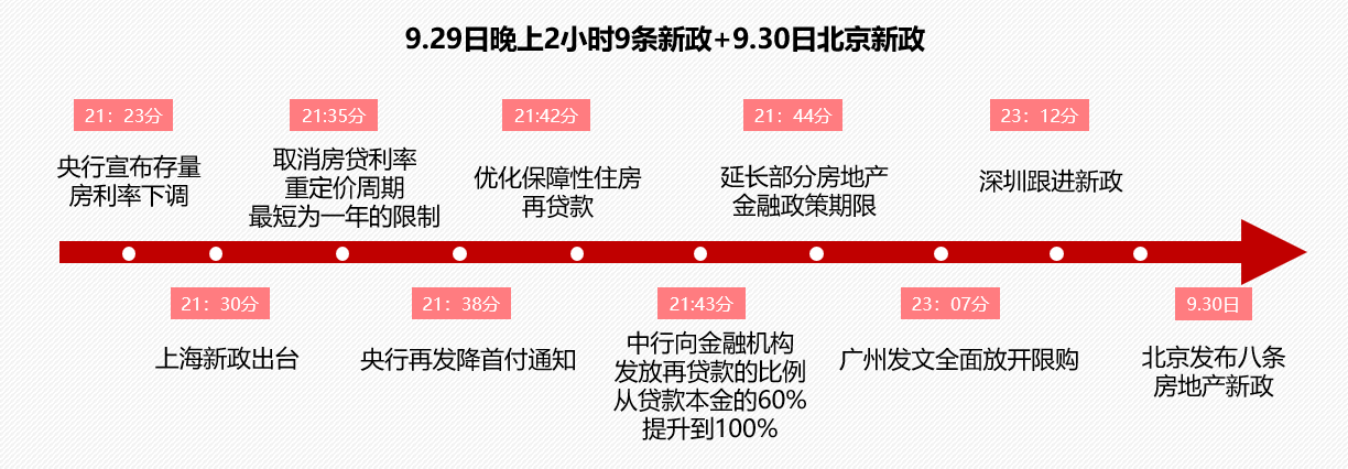 隨后在9月29日,時值國慶小長假前期,一系列利好政策來襲。央行金融四箭齊發,一線城市集中出臺重磅新政松綁“四限”響應“止跌回穩”。