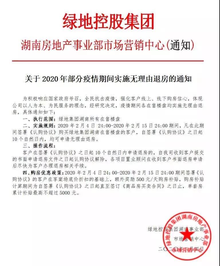 據路邊社消息,湖南綠地近日推出“無理由退房,每日500元補貼”政策,共同抗“疫”!