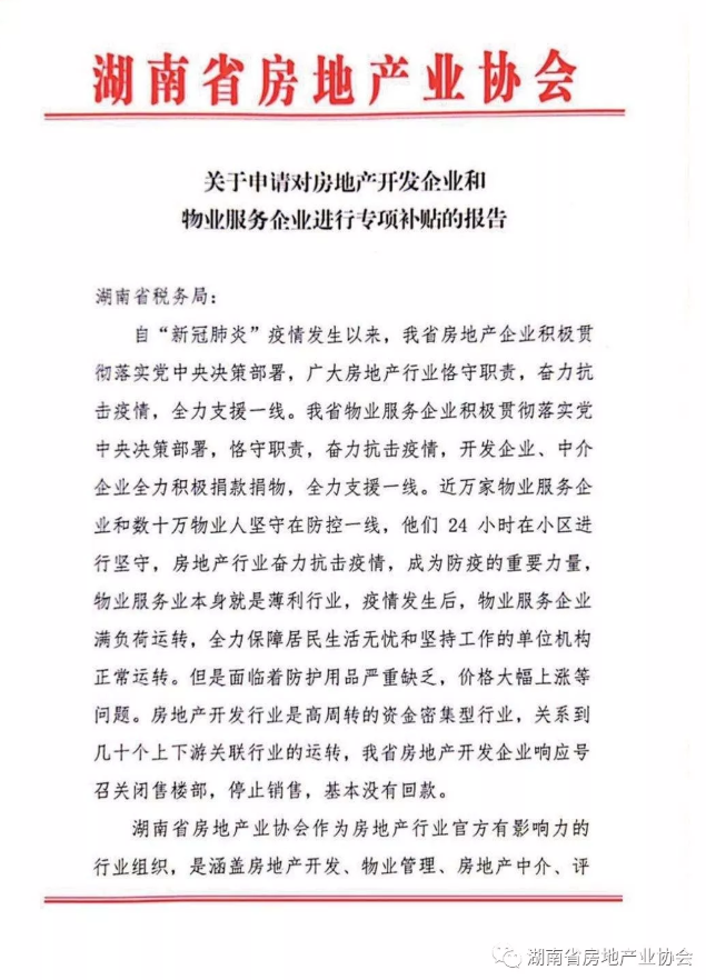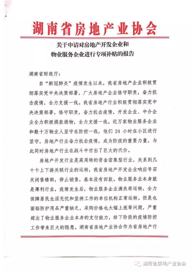 2月17日我會針對開發(fā)、物業(yè)、中介行業(yè)普遍存在的困難,向湖南省財(cái)政廳、湖南省稅務(wù)局分別提交了《關(guān)于申請對房地產(chǎn)開發(fā)企業(yè)和物業(yè)服務(wù)企業(yè)進(jìn)行專項(xiàng)補(bǔ)貼的報告》(以下簡稱“報告”),為行業(yè)爭取扶持政策,渡過難關(guān)。省住建廳領(lǐng)導(dǎo)非常重視,廳長及分管副廳長親自指導(dǎo)過問“報告”起草工作,省廳房產(chǎn)處與省財(cái)政、省稅務(wù)局、省發(fā)改委相關(guān)處室、部門多次對接,介紹行業(yè)存在的困難,介紹其他省份已經(jīng)出臺的幫扶政策,積極爭取政策幫助。