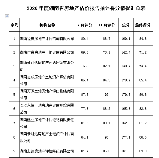 附件:2020年度湖南省房地產估價報告抽評得分情況匯總表