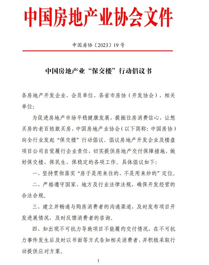 為促進房地產(chǎn)市場平穩(wěn)健康發(fā)展,提振住房消費信心,讓想買房的老百姓敢買房,中國房地產(chǎn)業(yè)協(xié)會向全行業(yè)發(fā)起“保交樓”行動倡議,全文如下: