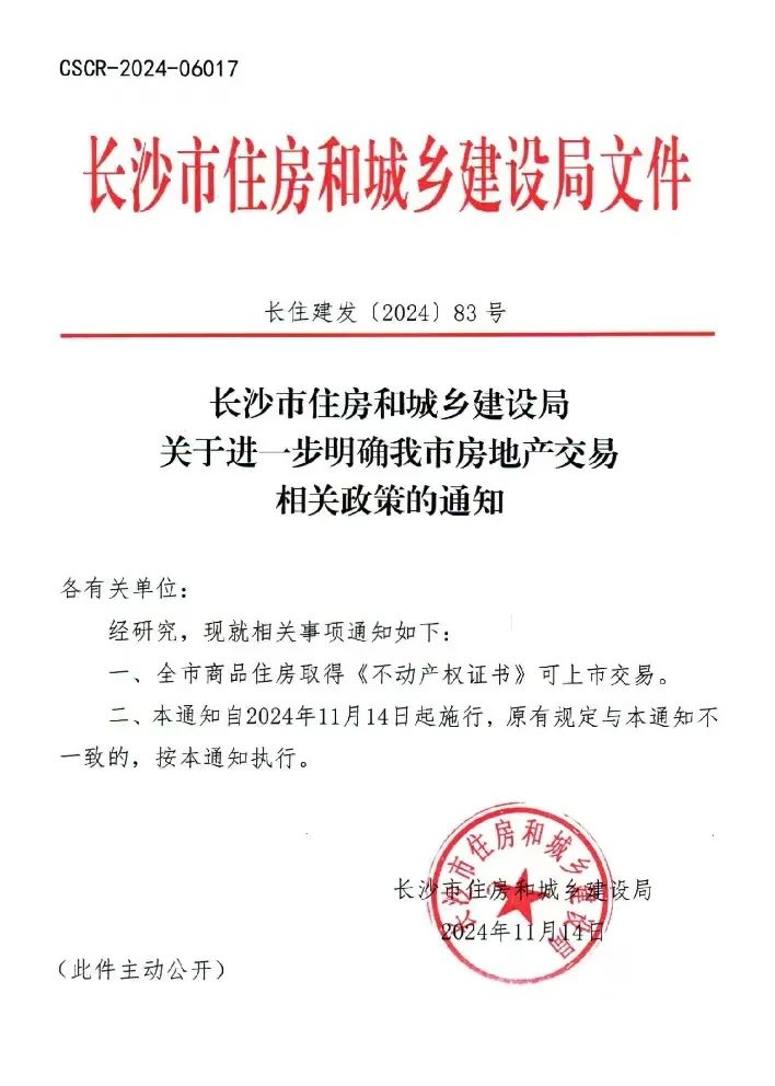 11月14日,長沙市住房和城鄉建設局發布《關于進一步明確我市房地產交易相關政策的通知》,明確全市商品住房取得《不動產權證書》可上市交易。此舉旨在優化房地產交易政策,支持居民住房消費,促進一二手房市場的良性循環,推動政府和市場的良性互動。