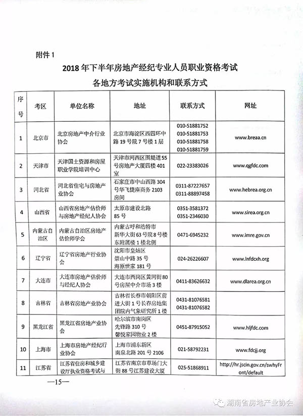 附件:1.2018年下半年房地產經紀專業人員職業資格考試各地方考試實施機構和聯系方式