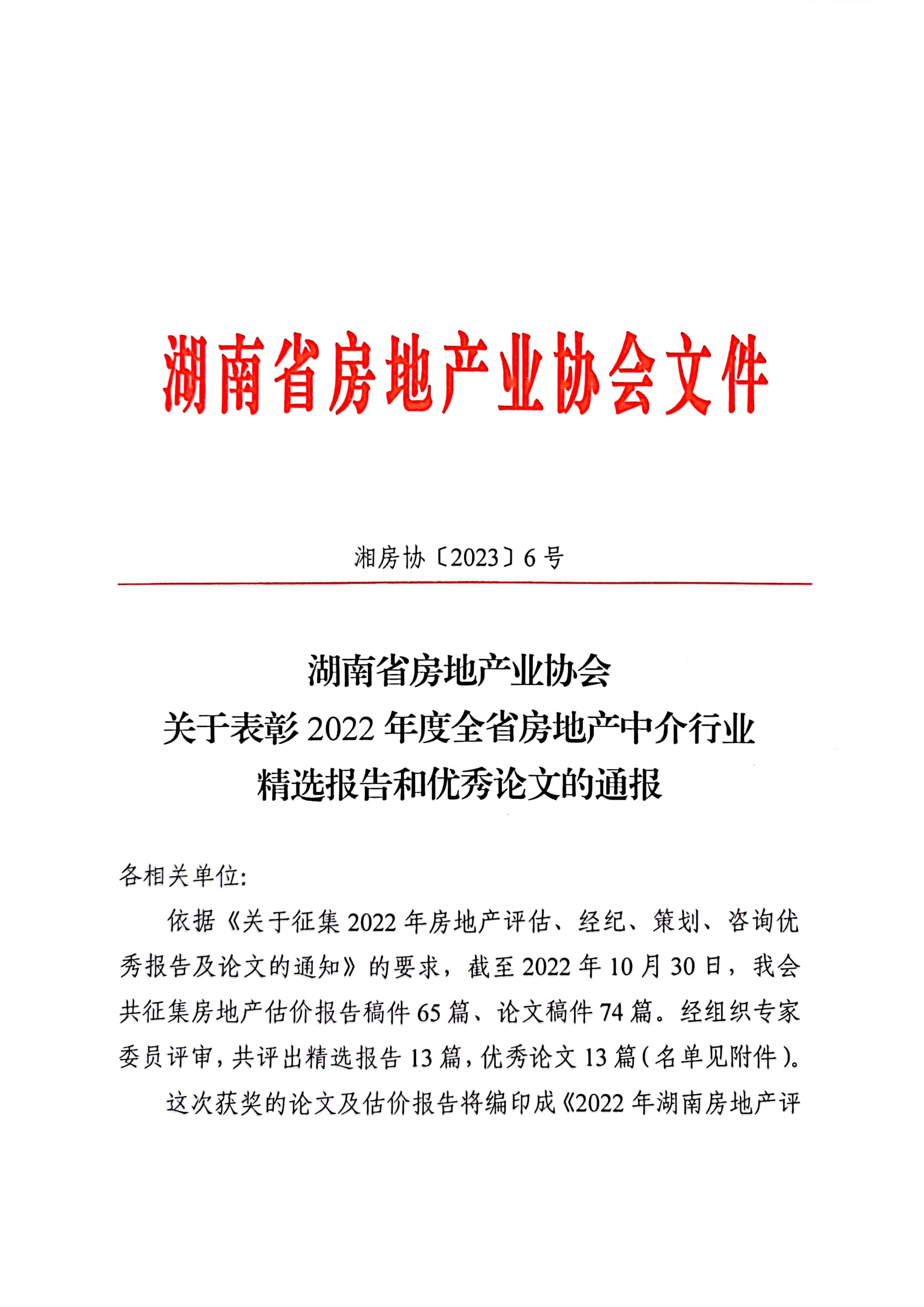關于表彰2022年度全省房地產中介行業精選報告和優秀論文的通報
