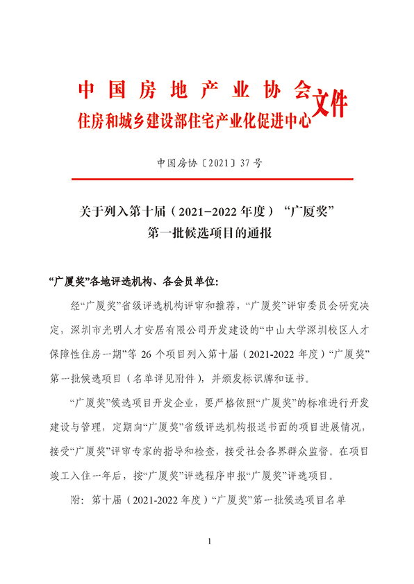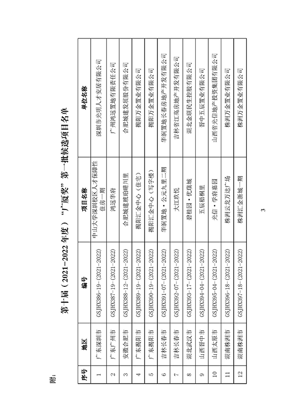 關(guān)于列入第十屆(2021-2022 年度)“廣廈獎(jiǎng)”第一批候選項(xiàng)目的通報(bào)